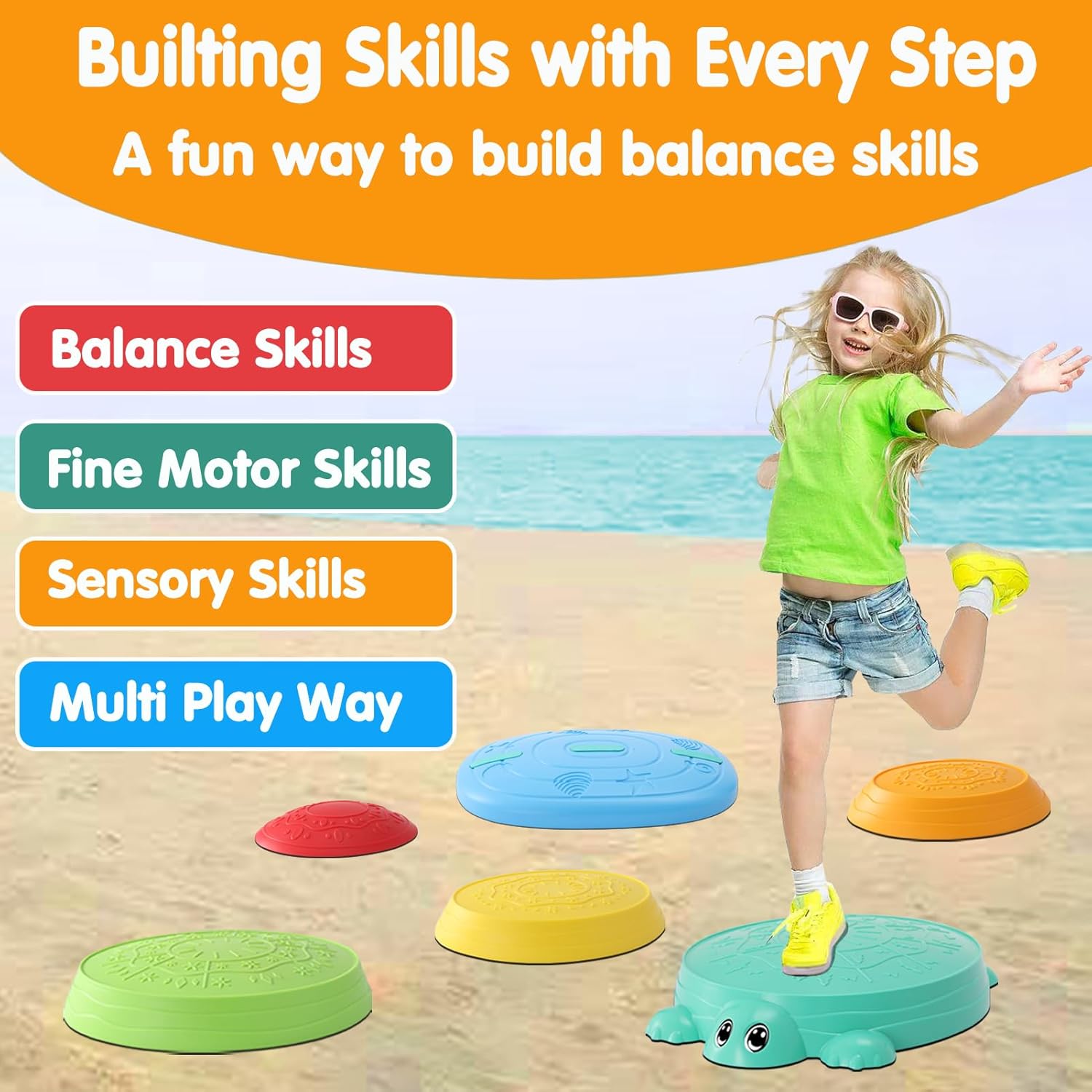 【2 IN 1 STEPPING STONES & BALANCE BOARD】Designed for kids ages 3-8,Includes 5 durable tactile turtle stepping stones and 1pcs high quality balance board with maze, each stone featuring bright colors to inspire creativity and adventure! This set of balance stones allows toddler ages 3-5 to walk, stand, jump, or climb, perfect for indoor and outdoor play. These sensory toys promote coordination & balance, making them an ideal gift for active kids and toddlers!