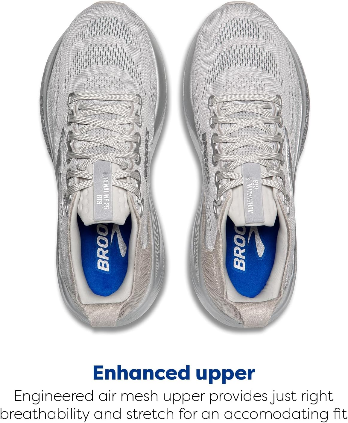 The Brooks Adrenaline GTS 25 shoe features a 3 mm of added DNA LOFT v3 cushioning in the forefoot and 1 mm in the heel, enhancing comfort and responsiveness. The nitrogen-infused DNA LOFT v3 midsole delivers lightweight softness and dynamic energy return, while the GuideRails support system helps reduce excess movement from heel to knee, promoting a smoother stride. The shoe’s engineered mesh upper and flatknit collar offer a secure, breathable fit, making it ideal for runners seeking a balance of support and plush cushioning. With its 10 mm offset, the Adrenaline GTS 25 maintains the trusted geometry of its predecessors while improving underfoot feel for distraction-free miles. Nylon lining and ethylene vinyl acetate insole. PDAC A5500 Approved: Pricing, Data Analysis and Coding A5500 Diabetic Medicare Coding is awarded to footwear that is available in three or more widths, with a removable insole (sock-liner). These attributes may allow a footwear style to be deemed an extra-depth shoe. It also allows individuals to pay for their footwear through their Medicare. PDAC must be applied for on a yearly basis and is not automatically available to styles that meet its criteria. For more specific info, visit the Medicare website or call 1-800-MEDICARE. APMA Approved: The American Podiatric Medical Association Seal of Acceptance is awarded to products that promote good foot health and are substantiated by a committee of discerning podiatrists by wear-testing and review of the application and supporting documentation. APMA Acceptance must be applied for and is not automatically available to styles that meet its criteria. Lace-up closure. Low-top, round toe silhouette. Rubber outsole.