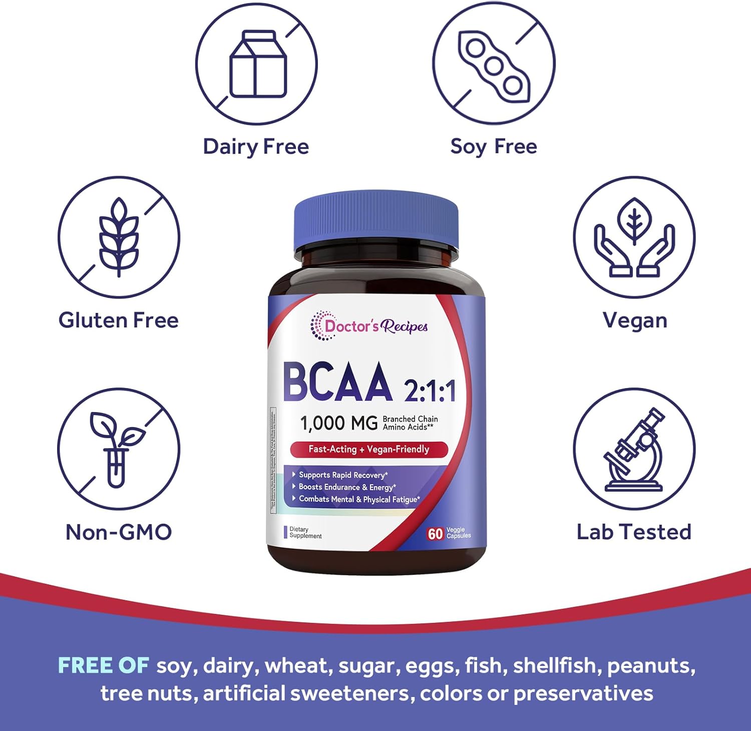 Doctor’s Recipes BCAA 1000 mg, 2:1:1 Ratio, L-Leucine, L-lsoleucine, L-Valine, Branched Chain Amino Acids, Fast Recovery, Endurance, Energy, Vegan, 60 Capsules