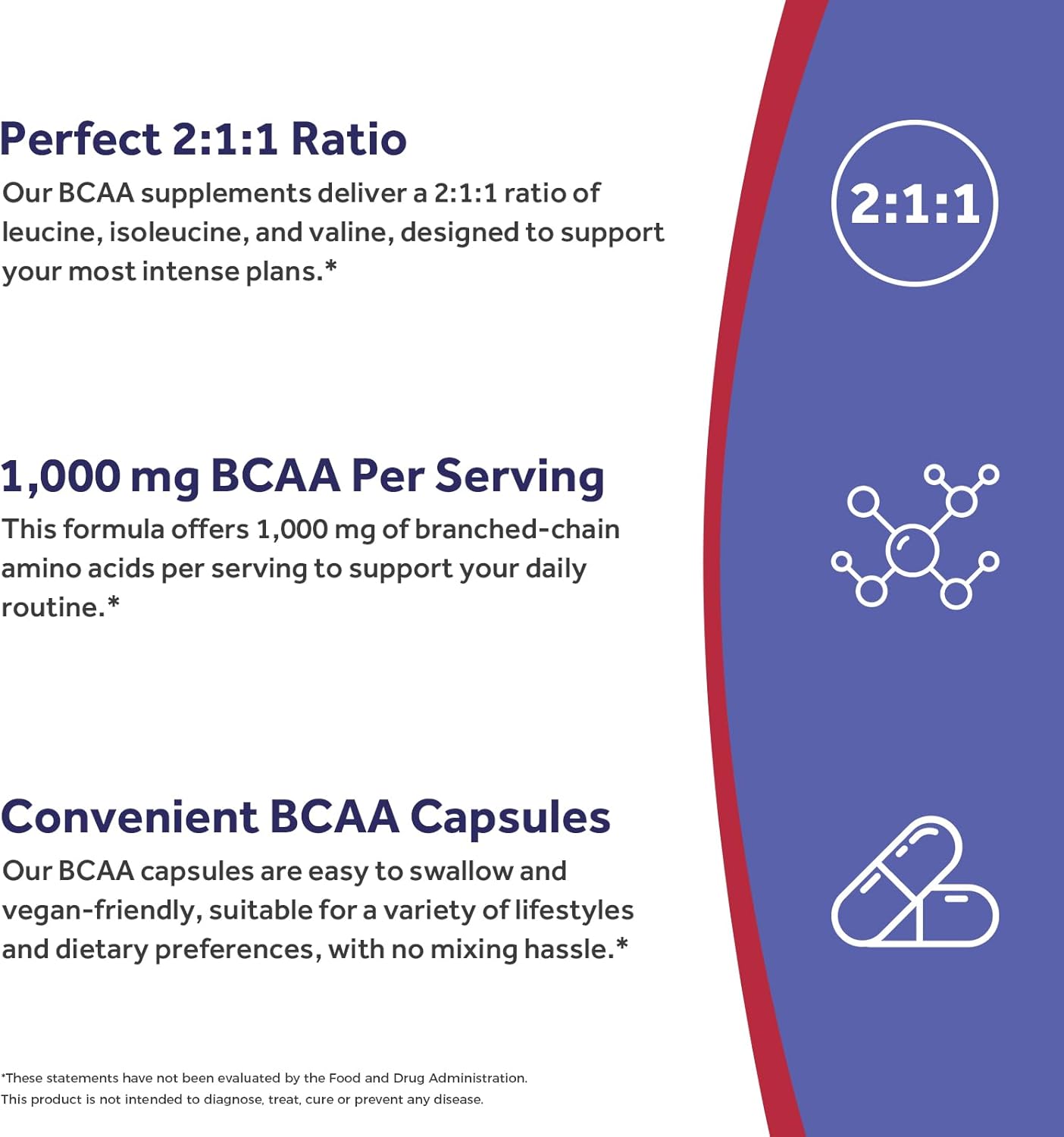 Perfect 2:1:1 BCAA Ratio: Our advanced formula features a precise 1,000 mg blend of branched-chain amino acids per serving, delivering the optimal 2:1:1 ratio of leucine, isoleucine, and valine to maximize your potential.* Designed for active lifestyles, our easy-to-swallow capsules keep you fueled before, during, and after your most intense plans without any mixing hassle.*