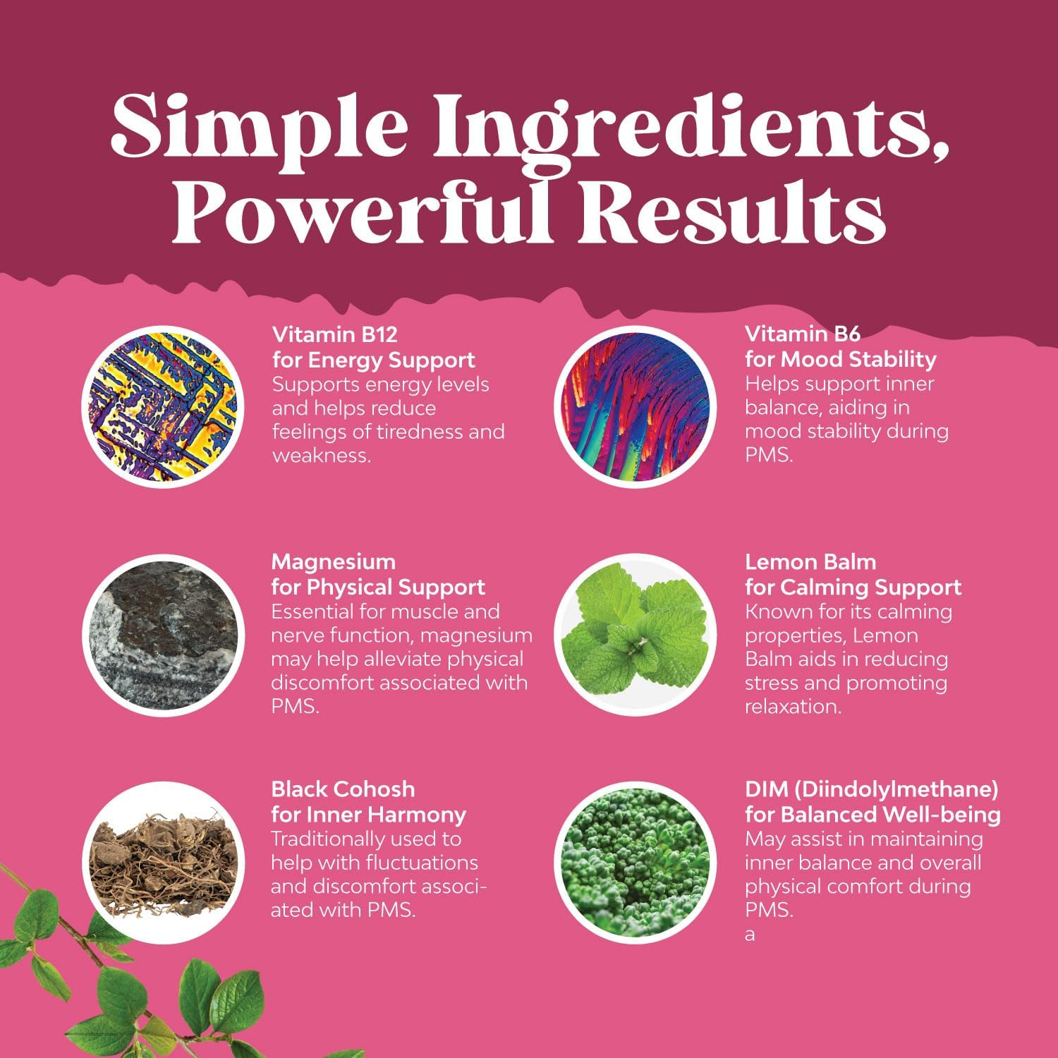 I have PMDD and found that the combination of Vitex, DIM, and Ashwagandha help treat my symptoms. I was taking these supplements separately until I found this and saw that it had all 3 along with black cohosh and lemon balm. After about a week of taking this supplement, I started to get headaches, nausea, extreme fatigue, and dizziness particularly in the afternoon/evening and by night I found myself having stomach pain. At first, I chalked this up to getting a stomach bug that was going around but after a week of these symptoms I thought I would do a little research and I found that black cohosh can cause severe stomach problems and headaches, and both black cohosh and lemon balm can cause dizziness and drowsiness. I stopped taking the supplement about 2 days ago and I am starting to have some relief from the symptoms but still having headaches and fatigue. Hoping that it will disappear in a few days and then I plan to go back to taking the DIM and Vitex without the black cohosh and the lemon balm.
